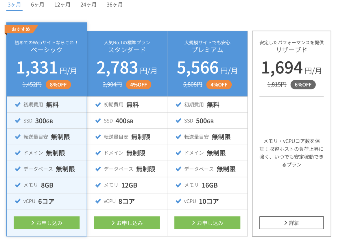 ベーシックプランで良い。契約期間は安いので12ヶ月がおすすめですが、まだブログを書き続けられるか不安、という人は3ヶ月を選ぶのがおすすめです。(流石に24ヶ月以上はあまりおすすめしません)
