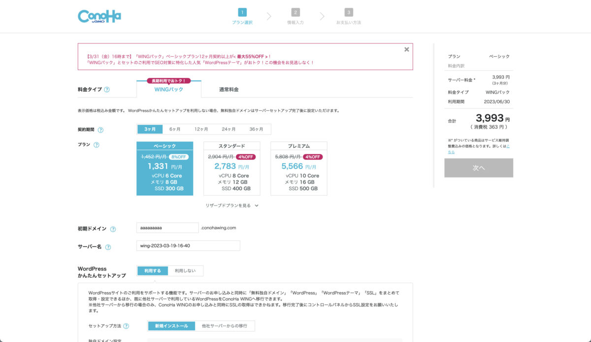 ConohaWingには月1500円程度のベーシックプラン、3000円程度のスタンダード、5000円程度のプレミアムプラン、1700円程度のリザーブドプランがありますが、月1500円のベーシックプランで全く問題有りません。(運が良ければ、期間限定でキャンペーンをしている時があるので、もっと安いかもしれません)