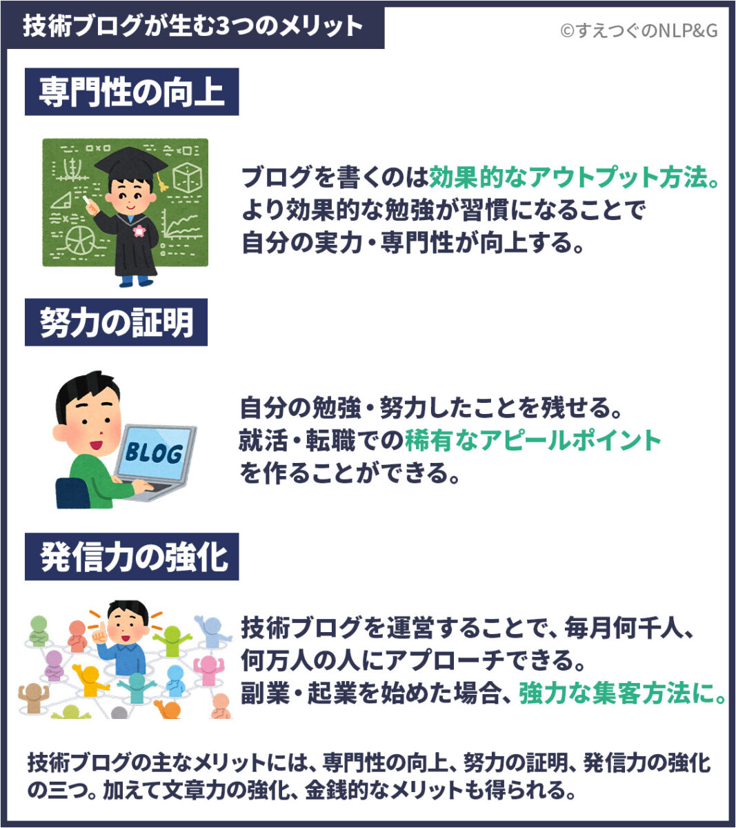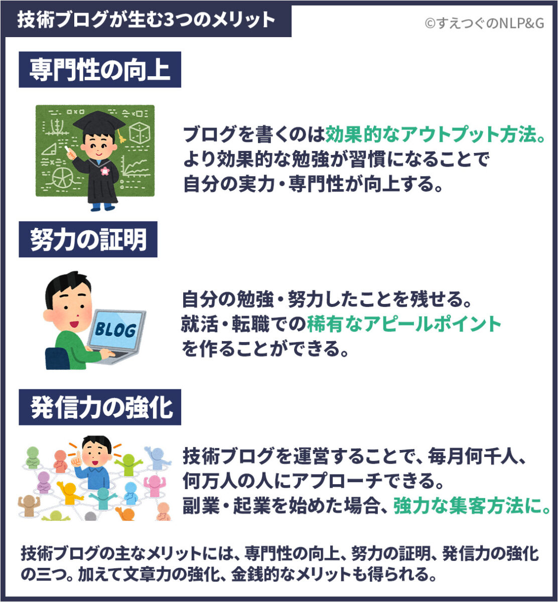 具体的には技術ブログを書くことで、以下の3つのメリットが得られます。