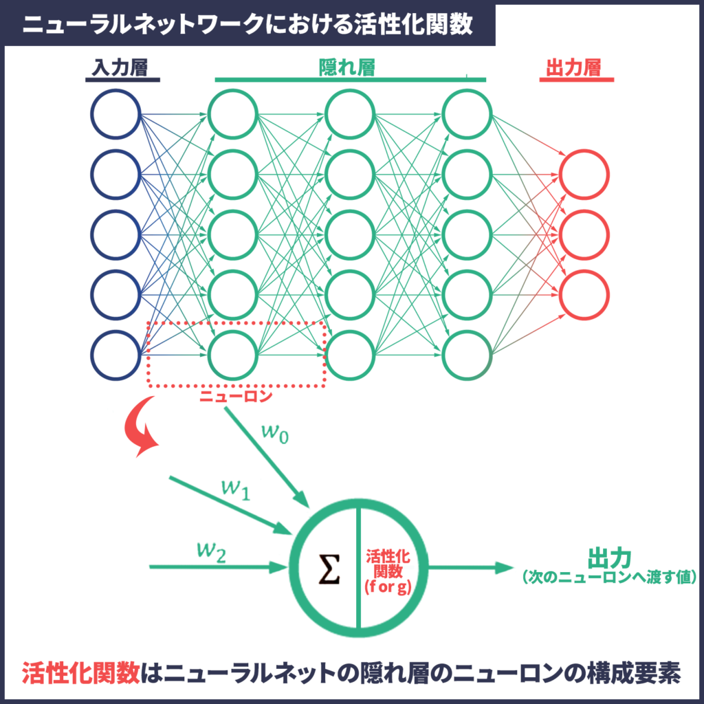 イラストの上部、ニューラルネットの図は見たことがある人も多いのではないでしょうか?このニューラルネットの隠れ層を構成している要素がニューロンです。さらにそのニューロンを構成する一部分が活性化関数なのです。