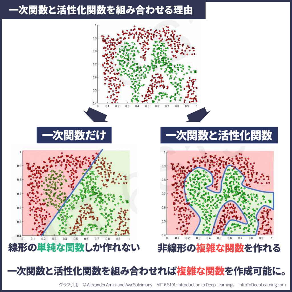 上のイラストを見るとわかるように、一次関数だけの場合は単純な関数しか作れず、複雑なデータに対応することができません。活性化関数と組み合わせることで、複雑な関数を作ることができるようになるのです。