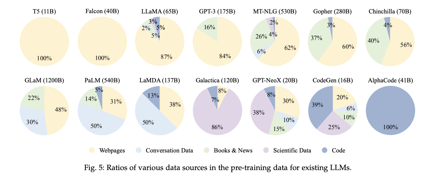 **LLMの用途に合わせて、これらのデータの種類から「どのデータをどんな割合で使用するか」決めます。**実際に、使用するデータの種類はモデルごとに様々です(下図)。