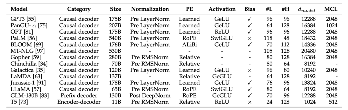 LLMの包括的サーベイ論文。アーキテクチャ・学習手法・応用を網羅。本記事の参考文献。