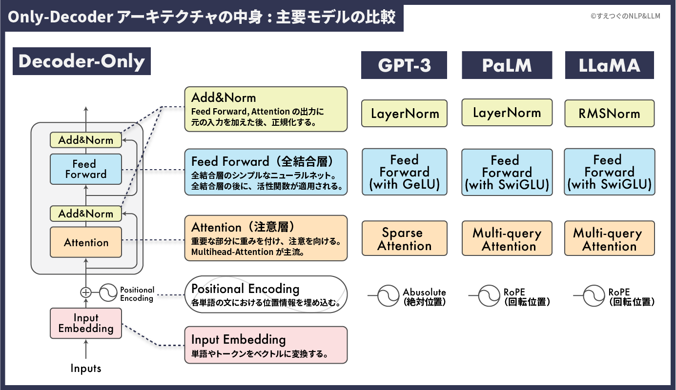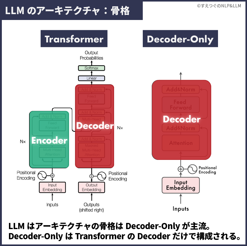 GPT・PaLM・LLaMAなど、ほとんどの最先端LLMは骨格にDecoder-Onlyを採用しています5。