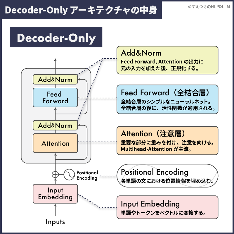 **ここからはDecoder-Onlyという骨格の中に、どのような部品が入っているのか解説していきます。**まず、Decoder-Onlyの中身を見てみましょう。