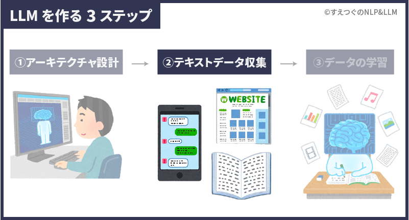 **まず、Webサイト・会話データ・本などからテキストデータを収集します。**それぞれのデータには特徴があり、「どんなデータをLLMに学ばせるか?」でLLMの性能や特徴は変わってきます。