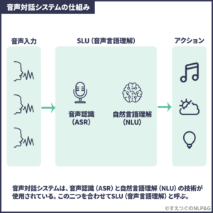 SLUとはSLUはSpoken Language Understandingの略で、特に「人の声による入力を理解する」技術です。この技術が音声対話システムで「ユーザーが何をしたいか?」を理解する、核となる技術です。
